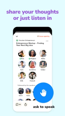 Vai nu jūs vēlaties aktīvi izteikt savas domas, dalīties ar unikāliem ieskatiem, vai arī dodat priekšroku mierīgi klausīties, baudot citu viedokļu daudzveidību, lietotne piedāvā visu nepieciešamo interakcijai. Paceliet virtuālo roku, lai pievienotos diskusijai, vai vienkārši ērti iekārtojieties un ļaujieties sarunu plūdumam. Vēl vairāk, jūs pats varat kļūt par kopienas pulcētāju, izveidojot savu sarunu telpu un vadot diskusijas par tēmām, kas jūs aizrauj, iedvesmojot citus un veicinot jaunus sakarus.