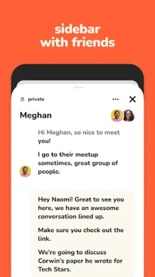 Saziņa neapstājas līdz ar tiešraides sarunu beigām. Ar privāto sānu tērzēšanu funkciju jūs varat turpināt sarunas ar draugiem gan telpu laikā, gan pēc tām, pat ja neesat tiešsaistē vienlaicīgi, nodrošinot nepārtrauktu savienojumu. Ielēciet dažādās telpās visas dienas garumā – braucot sabiedriskajā transportā, kārtojot ikdienas darbus vai sportojot. Katrs mirklis ir iespēja nejauši sastapties ar jauniem, interesantiem cilvēkiem un atklāt negaidītas diskusijas, kas bagātinās jūsu ikdienu un paplašinās jūsu redzesloku.